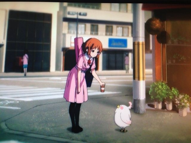 こんにちは!支線ガードっちです!前回は「たまこまーけっと」に登場出来なかった支線ガードを紹介しましたが、今回はついに?出演することのできた支線ガードを発見、実際に現地から支線ガードレビューをお届けします。それでは早速第9話「歌っちゃうんだ、恋の歌」での登場シーンから…あんこちゃんが橋を渡っています。画面左手に電柱、支線、そして支線ガードが確認出来ます。