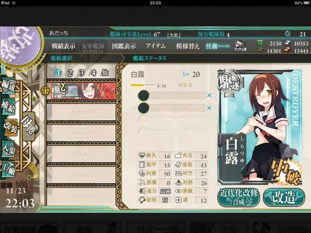 前回のアップデートで「白露」のグラフィックが変更になり、それが「けいおん!」の平沢唯ちゃんみたいになりました。イベント海域で苦戦しまくっていたうえに、「伊19」、「伊58」と立て続けに沈ませてしまったので息抜きがてら「白露」を改造してみようということになった訳です。これが改造前、従来のグラフィックです。被弾してますが…
