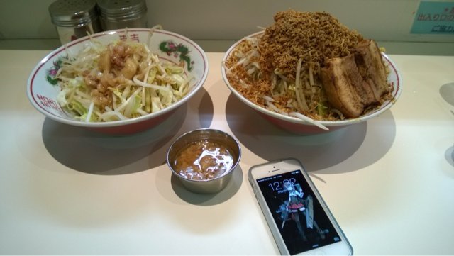 奥に比較の為にXperia Z1fを置いてみました。麺は300gなので軽く食べるにはいい量ですね。