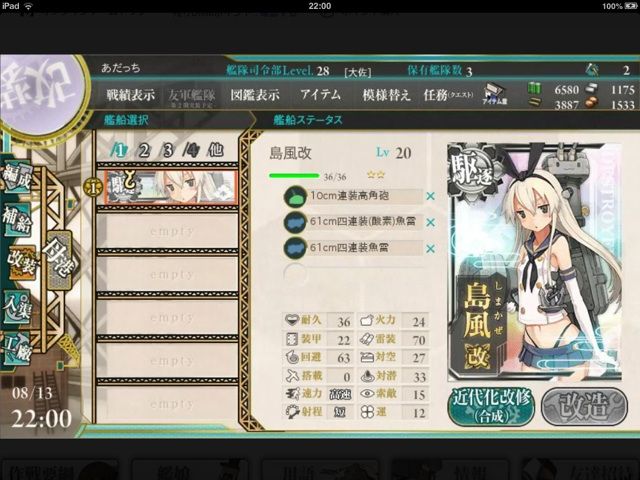 編成は「Верный」を目指す「響」と速力自慢の「島風」の2トップです。駆逐艦だけなのでボス戦前の戦艦相手が少し心配ですね。捨て艦作戦とかも試しましたが、結局は2トップとレベル30台の駆逐艦娘で…