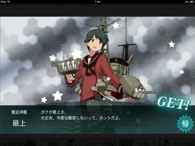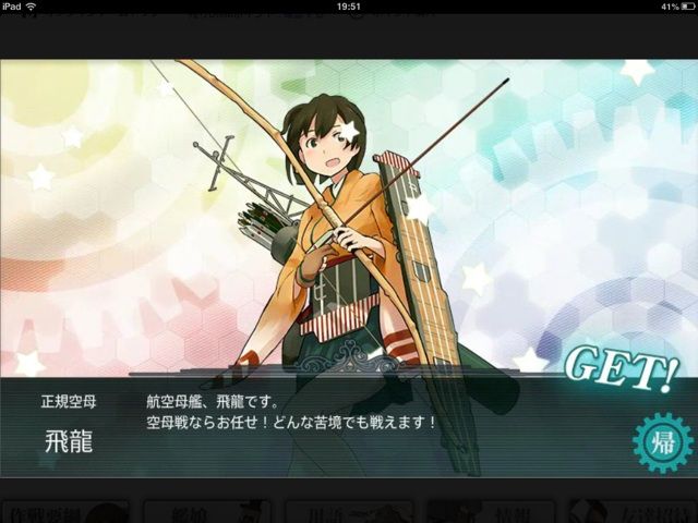 3-2で行き詰まっていた時に駆逐艦娘のレベル上げに併せた形で他の艦娘のレベルも底上げされていたからでしょうか?レベル71のハイパー北上さんが活躍してくれました。そして初めての「飛龍」もドロップされました。